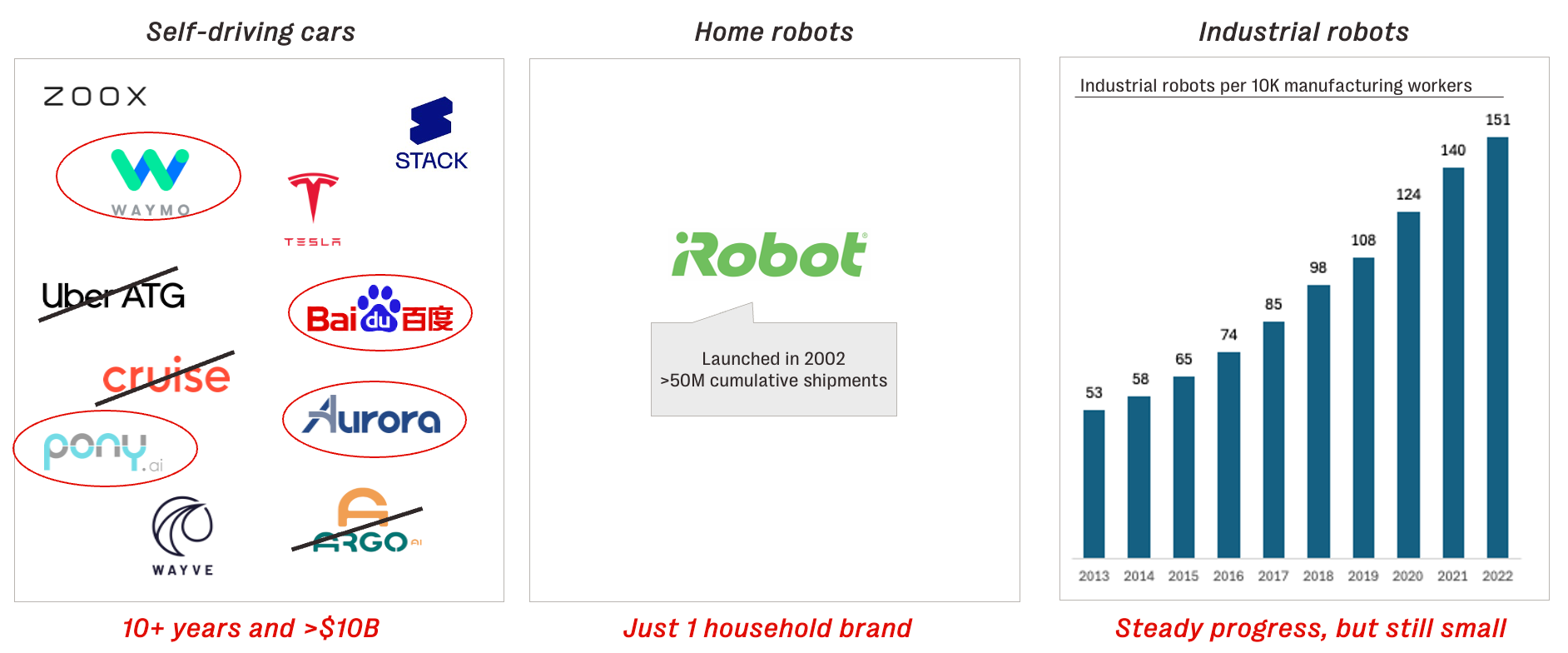 Yet skepticism is warranted. Robotics has long been defined by persistent challenges: iRobot, maker of the Roomba and the most widely recognized consumer robotics brand, is on the verge of bankruptcy; industrial robots, while steadily advancing, still represent just a fraction of global manufacturing jobs; and autonomous vehicles have taken over a decade and tens of billions of dollars just to reach initial deployment.