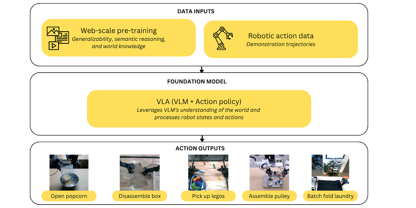 The current frontier in robotic manipulation is largely centered on vision-language-action (VLA) models — end-to-end systems that map high-level language commands and raw environment observation inputs directly into continuous actions. These models are typically trained via IL, where robots learn by mimicking human demonstrations. Early work from projects like the RT series (RT-1, RT-2, RT-X), Gemini Robotics, and Pi (π0 and π0.5) suggest several promising findings: