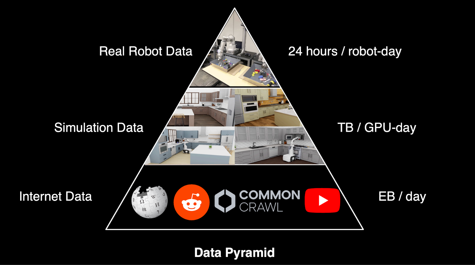 This problem is compounded by the fact that robots learn through physical interaction in high-dimensional, continuous state-action spaces. Every robot action might involve dozens of joint positions, varying forces, and complex contact dynamics — multiplied across a nearly infinite range of objects and environments. This makes both the scale and diversity of data essential for progress.